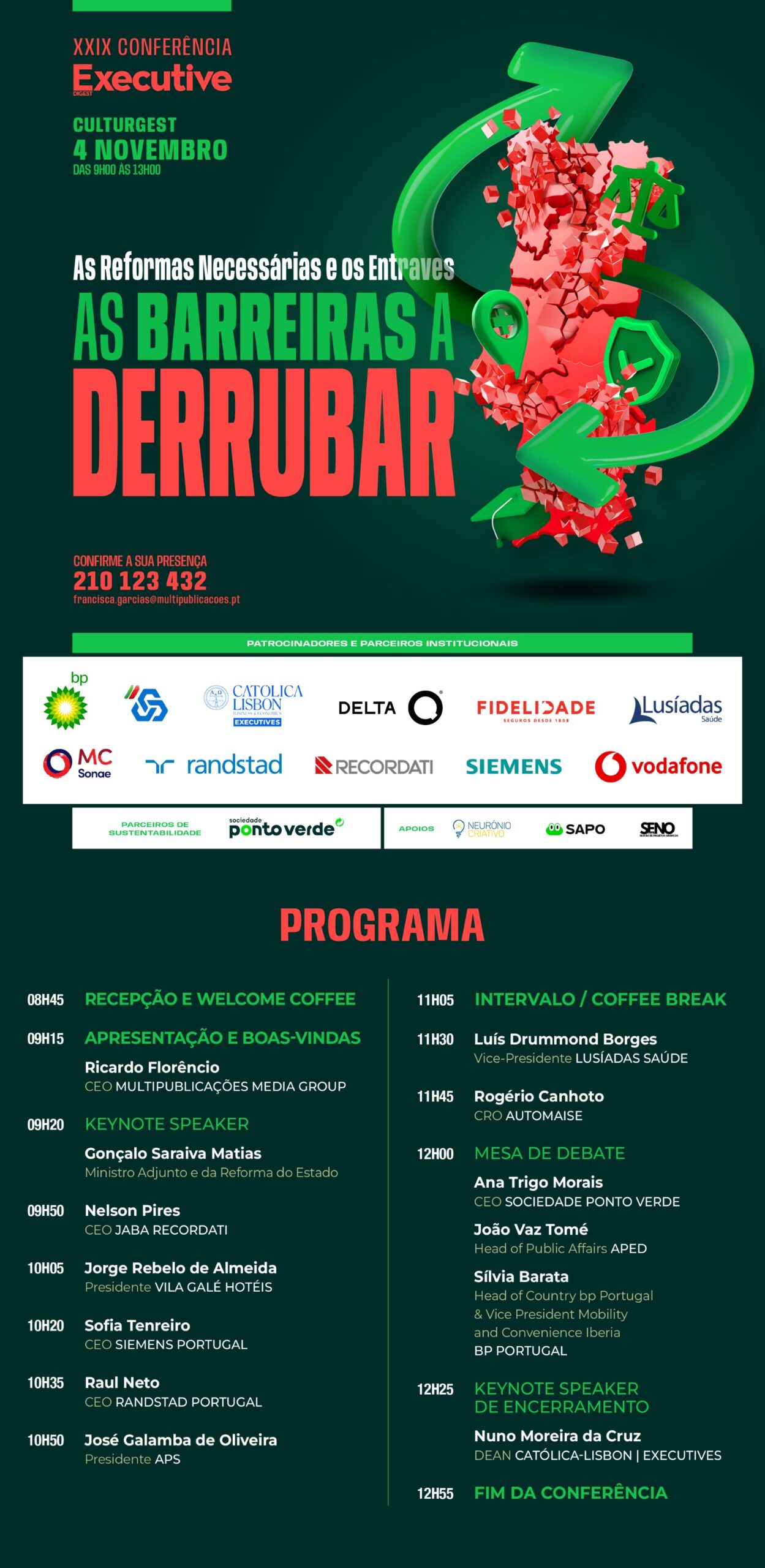 A Conferência conta com o patrocínio da BP, CGD, Católica Lisbon, Delta Q, Fidelidade, Lusíadas Saúde, MC Sonae, Randsatd, Recordati, Siemens, e ainda com o apoio da Capital MC, Neurónio Criativo e Sapo. A Sociedade Ponto Verde é o Parceiro de Sustentabilidade do evento.