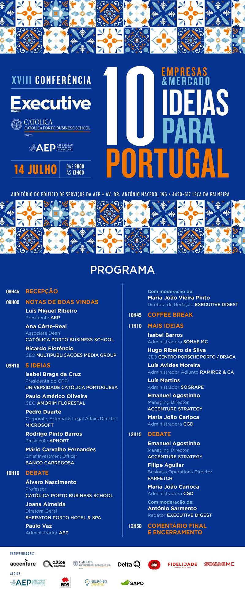 “10 ideias para Portugal” é o tema da XVIII Conferência Executive Digest, que decorre já amanhã, 14 de Julho. O evento será também transmitido em directo no website da Executive Digest, assim como nas suas redes sociais.