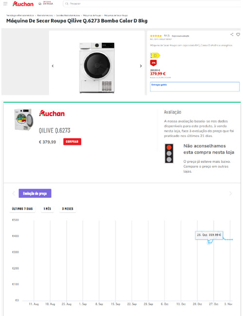 Quando a DECO PROteste visitou a loja online da Auchan, que lançou a sua campanha de Black Friday a 1 de novembro, a máquina de secar roupa Qilive Q.6273 Bomba Calor D 8 kg estava a ser vendida por 379,99 euros. Contudo, apenas dias antes, a 25 e a 26 de outubro, a mesma máquina de secar estava à venda na mesma loja por menos 20 euros, a 359,99 euros. Quem a compre agora, durante a campanha, não obtém um verdadeiro desconto.