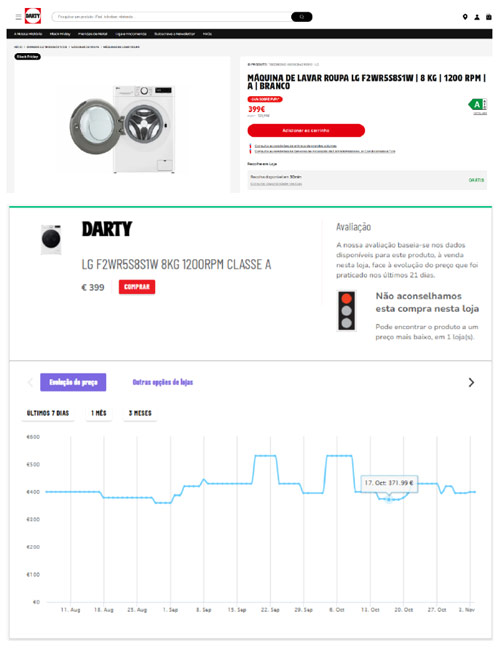 Na página de venda do produto, a Darty apresentava ainda um PVPR de 529,99 euros junto ao preço de venda do produto, assim como um suposto desconto de 24%. Feitas as contas, o consumidor poderia ser levado a pensar que estava a poupar 130,99 euros. Contudo, apesar de a loja já ter vendido a máquina de lavar a 529,99 euros, entre 4 a 9 de outubro, este foi o preço mais alto a que o vendeu, e não o preço mais baixo nos 30 dias anteriores ao início da campanha, como obriga a lei quando são anunciados descontos.
