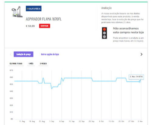 Já na campanha “Achados da Semana”, que decorre na loja online Euronics de 3 a 9 de novembro, o aspirador Flama 1670FL estava a ser vendido por 59,99 euros, quando apenas um dia antes tinha estado à venda por um preço mais baixo, a 54,07 euros.