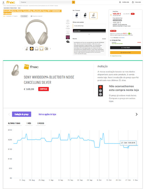 Exemplo disso é o desconto anunciado nos auscultadores Noise Cancelling Bluetooth Sony WH-1000XM4. Nos dias em que este estudo foi feito, estavam à venda por 169,99 euros, mas apenas um dia antes do início da campanha de Black Friday estavam a ser vendidos na FNAC por menos 10,99 euros, a 159 euros, como mostra a ferramenta Comparar preços, da DECO PROteste.