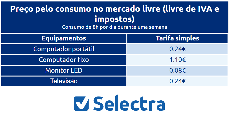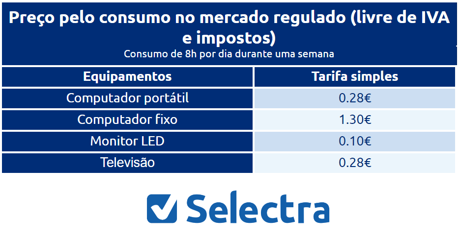 Para economizar, a Selectra recomenda o uso de um computador portátil aliado a um monitor LED extra, o que resultaria em um gasto de 0,32 euros por semana no mercado livre, ou 0,38 euros no mercado regulado.