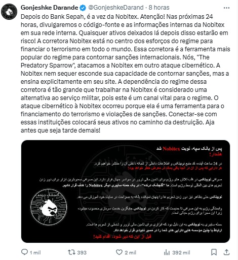 Numa publicação na rede social X (antigo Twitter), os hackers acusaram a Nobitex de “financiar o terrorismo” e ameaçaram divulgar ficheiros internos da plataforma nas próximas 24 horas, advertindo os utilizadores de que “quaisquer ativos restantes estarão em risco”.