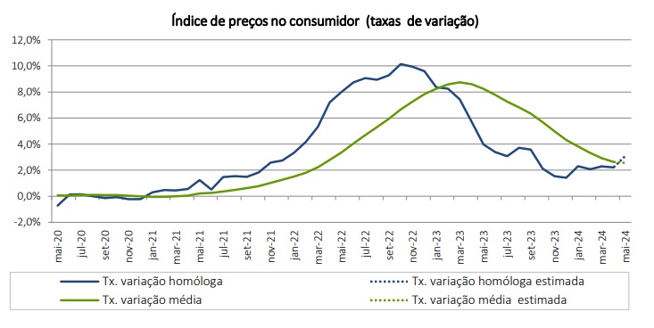 De acordo com o gabinete de estatística, a aceleração resulta essencialmente do efeito de base associado à redução mensal de preços registada em maio de 2023 (-0,7%), no seguimento da isenção de IVA num conjunto de bens alimentares essenciais. O indicador de inflação subjacente (índice total excluindo produtos alimentares não transformados e energéticos) terá registado uma variação de 2,7% (2,0% no mês precedente).