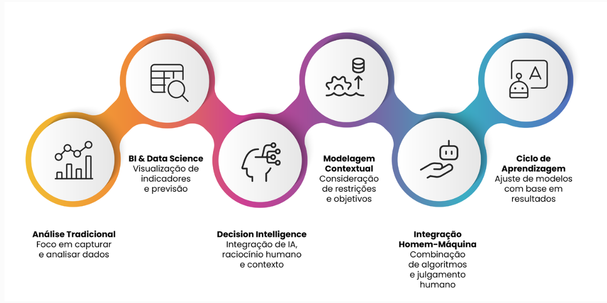 Na prática, a DI é uma evolução do paradigma analítico tradicional. Enquanto o BI e a ciência de dados concentram-se em entender “o que aconteceu” e “o que pode acontecer”, a DI responde a uma questão mais estratégica: “o que devemos fazer e porquê”.