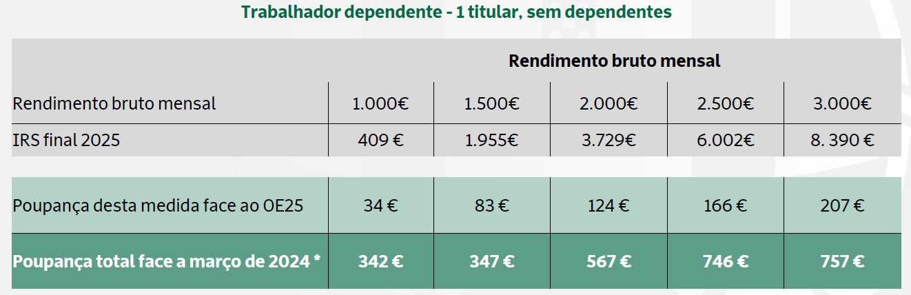 Veja-se o caso de um contribuinte solteiro, sem filhos, com um rendimento bruto mensal de mil euros: a poupança será de 34 euros face ao previsto no Orçamento do Estado de 2025 e de 342 euros em relação a março do ano passado.