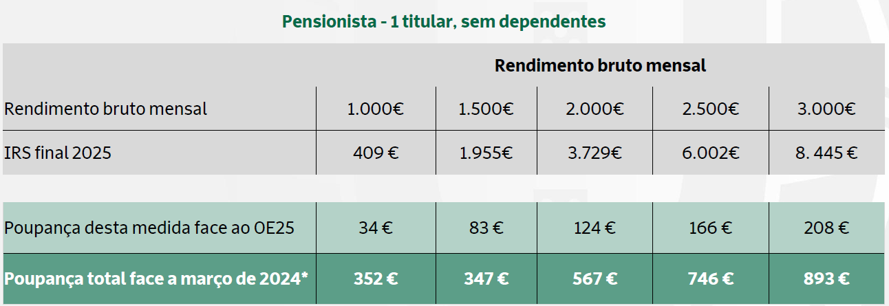 No caso dos pensionistas, tome-se em consideração um titular sem dependentes, com um rendimento bruto mensal de mil euros: a poupança proposta pelo Governo será de 34 euros anuais face ao previsto e de 352 euros se comparado com os escalões de março do ano passado. Já se o pensionista receber 2.500 euros, poupa 166 e 746 euros, respetivamente.