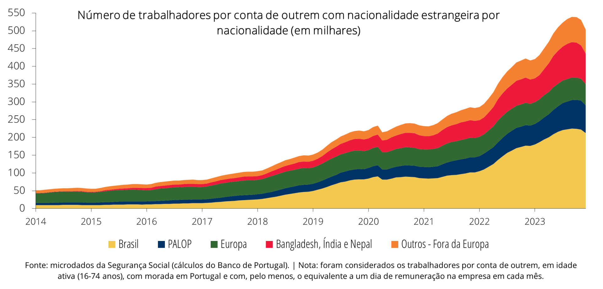 De acordo com os dados do Boletim Económico do Banco de Portugal, entre 2014 e 2023, o número de trabalhadores por conta de outrem com nacionalidade estrangeira inscritos na Segurança Social aumentou de 55,6 mil para 495,2 mil, representando 2,1% e 13,4% do total de trabalhadores por conta de outrem em cada um destes dois anos, respetivamente.