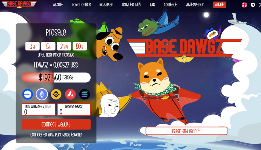 Base Dawgz, cujo token se denomina $DAWGZ, lançou recentemente a sua pré-venda com enorme sucesso. Já está perto de alcançar a marca dos $2 milhões em capitalização só nesta fase inicial de Initial Coin Offering (ICO), o que dá esperanças para uma explosão de preços logo que negocie em DEX e Exchanges.
