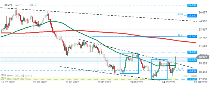 O preço da prata está a subir mais de 7%, registando assim a maior subida desde fevereiro de 2021. O preço do metal está a disparar esta segunda-feira e a testar a zona de resistência nos 20 dólares, sendo que o próximo alvo para os compradores deverá ser marcado pelos 21 dólares.