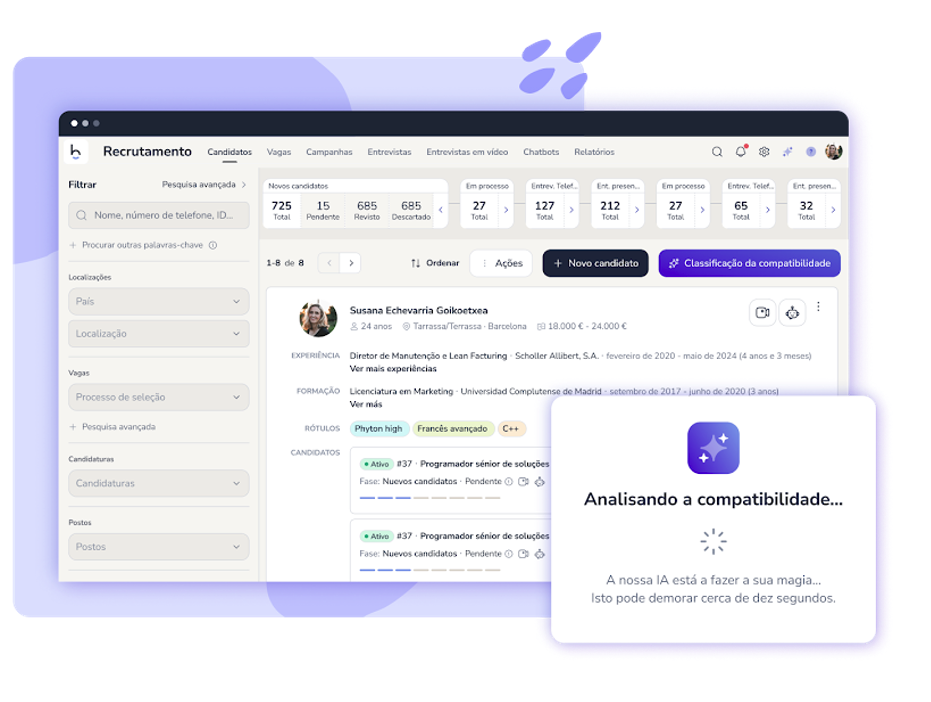 - Recrutamento com matching inteligente: o módulo ATS cruza os perfis de candidatos com os requisitos da vaga, acelerando a seleção com mais rigor e menos esforço.