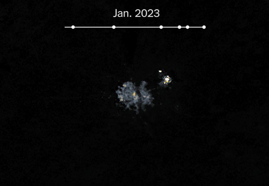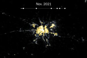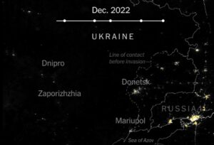 O cenário é particularmente notório em Kiev, capital da Ucrânia, que passa de uma cidade muito iluminada, em novembro de 2021, para um ínfimo aglomerado de luzes, em janeiro de 2023, parecendo que ‘encolhe’ à medida que a guerra devastava o país.