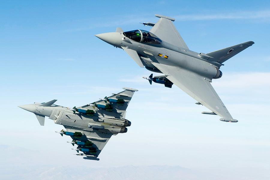 Os caças Eurofighter Typhoon são aeronaves bimotor construídas pelo Reino Unido em conjunto com a Alemanha, mas também com Espanha e Itália, e podem ser usados para proteção do espaço aéreo, mas também como aeronave de combate, sendo capaz de destruir alvos em terra e no mar.