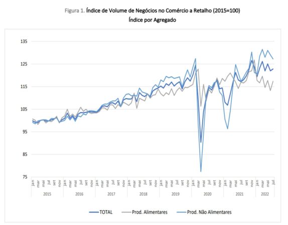 De acordo com os dados divulgados esta terça-feira pelo Instituto Nacional de Estatística (INE), o Índice de Volume de Negócios no Comércio a Retalho passou de uma variação homóloga de 3,4% em junho para 4,8% em julho 2022.